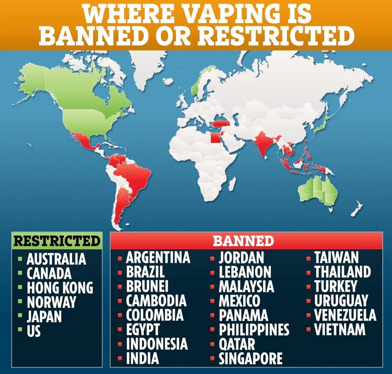 - Thailand & Mauritius: Strict bans, with penalties including fines up to $900 and custodial sentences of up to 10 years (ECigator, 2023).