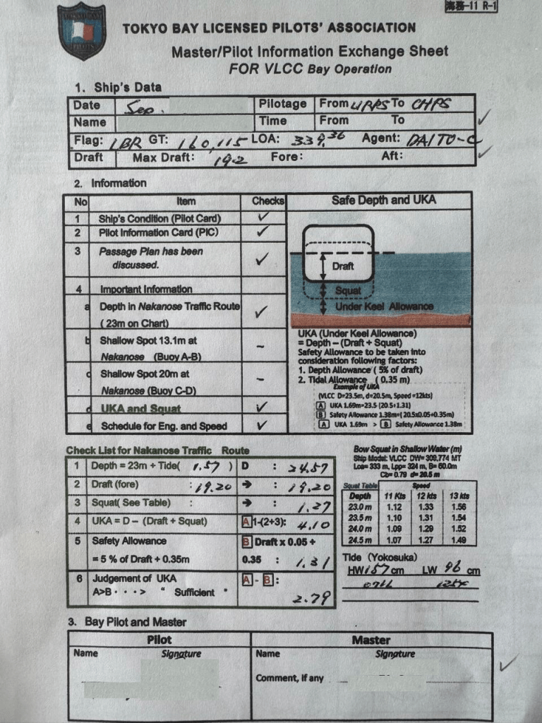 Before arrival or departure, the Master–Pilot Information Exchange Sheet is completed. It lists under-keel clearance (UKC), squat allowance, safe depth, and expected tide rise, all verified and signed by both Master and Pilot. Nothing is left ambiguous.