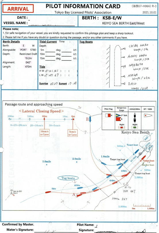 During approach, the pilot carries the Pilot Information Card which is not a generic form, but a hand-annotated version studied and prepared for that specific voyage. Pilot cards exist in many ports today, but the precision and discipline with which they are used in Japan are on a different level.