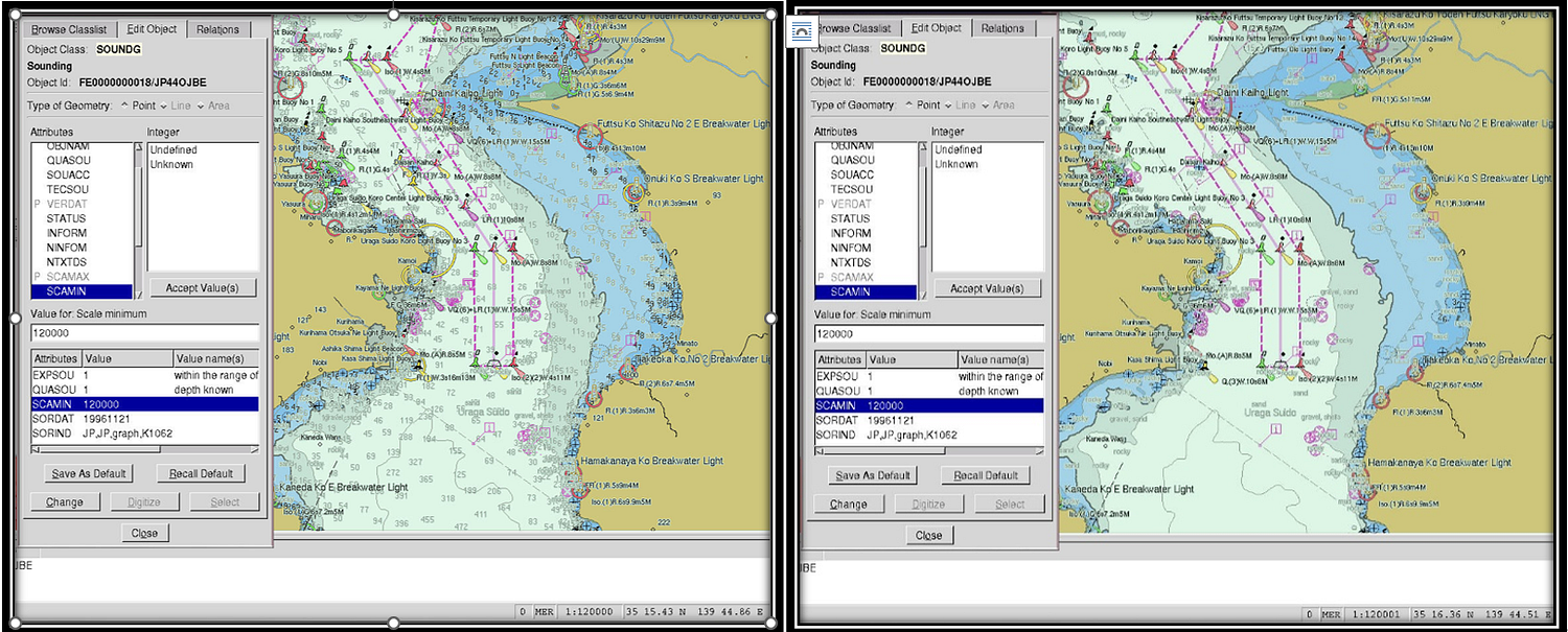 SCAMIN threshold demonstration. soundings remain visible at their defined limit (1:120,000) but vanish as soon as the scale is reduced further (1:120,001). This illustrates how SCAMIN removes detail to prevent clutter when zoomed out