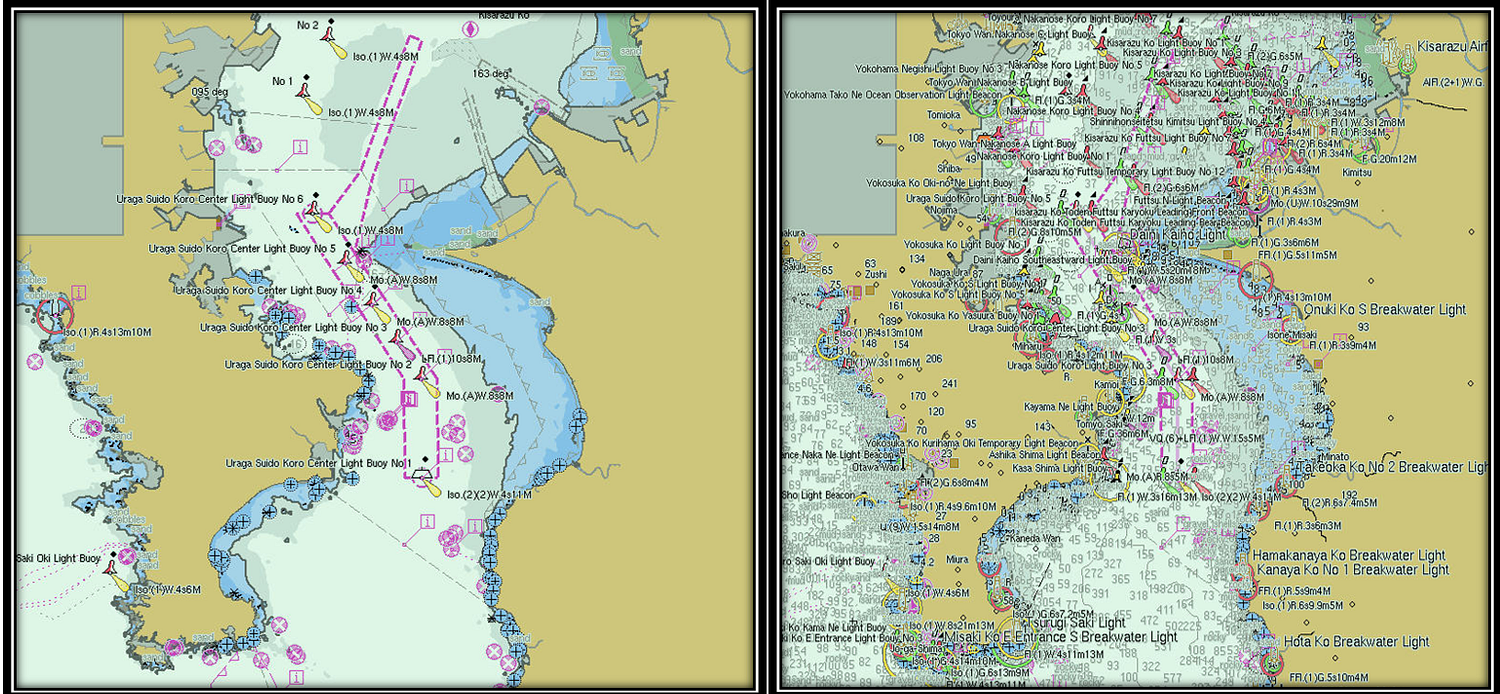 ENC at 1:200,000 scale, with SCAMIN (left) the chart is simplified and remains readable; without SCAMIN applied (right) the chart display is cluttered.